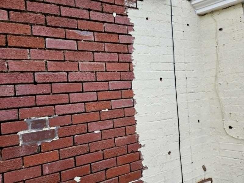Specialist DOFF and FALCH systems were used to safely remove paint without damaging the underlying masonry, with tower scaffolding providing secure access throughout the project.